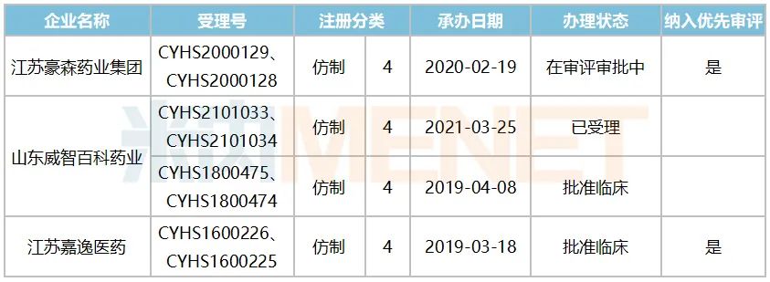 江苏嘉逸医药以及山东威智百科药业在2019年提交了该产品4类仿制上市申请并获批临床,其中江苏嘉逸医药被纳入了优先审评,理由同样为“专利到期前1年”,目前生物等效性试验正在进行中;山东威智百科药业在的生物等效性试验于2020年6月完成,公司再度提交4类仿制上市申请,紧跟豪森的脚步争夺该品种的国内首仿。