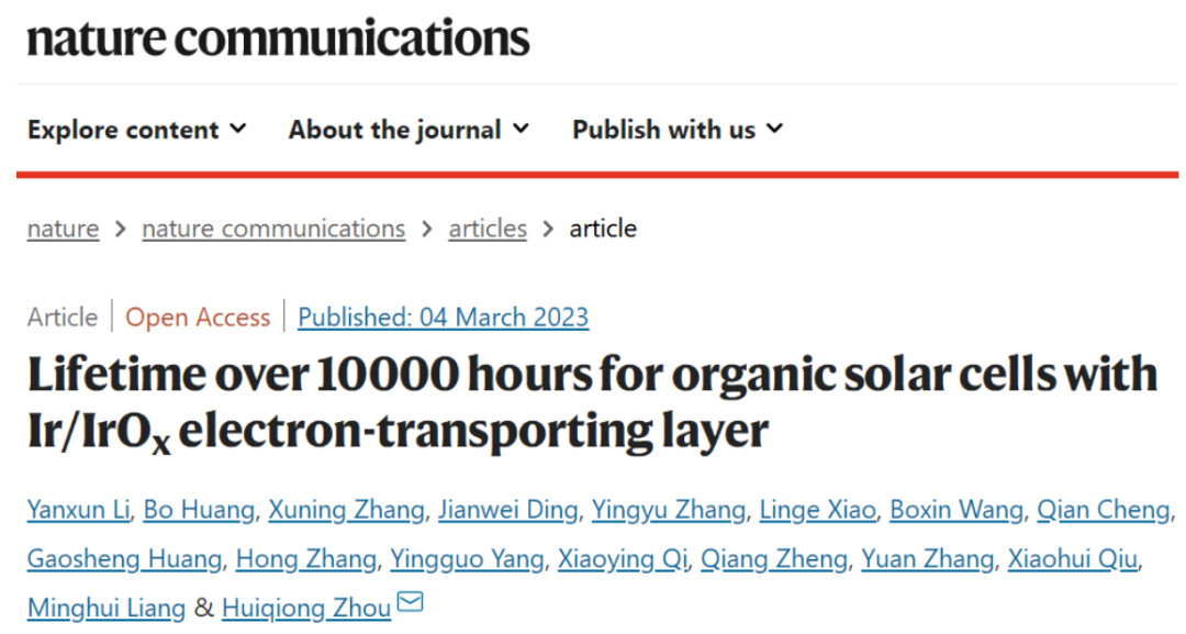 1.Li, Y., Huang, B., Zhang, X.et al. Lifetime over 10000 hours for organic solar cells with Ir/IrOx electron-transporting layer. Nat Commun 14, 1241 (2023). https://doi.org/10.1038/s41467-023-36937-8