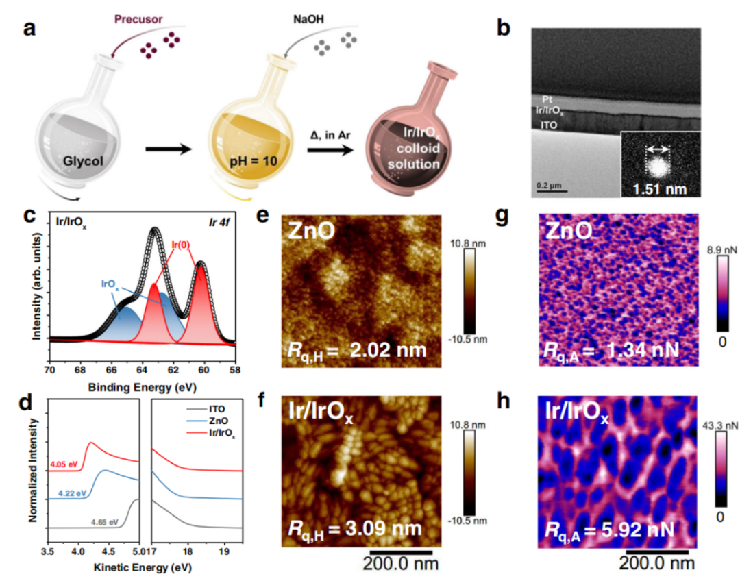 得益于该材料合适的功函数、非均一性的微观表面能分布、以及光学调控作用,基于 Ir/IrOx 纳米颗粒的器件展现出更优异的光电性能。与 ZnO 器件相比,该器件可以获得改善之后的电荷提取和抑制的电荷复合,进而提升器件效率。