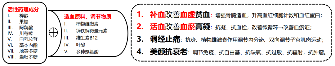 药理学研究表面:有效成分-信号通路-靶点-补血/活血的药理作用,关联性清晰,临床应用广泛