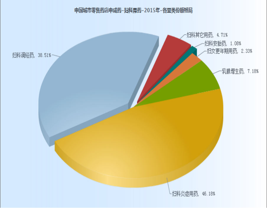 妇科中成药市场,妇科炎症用药、妇科调经药占据了84.69%的市场份额;