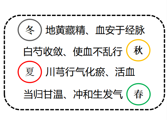 [小结] :四物汤原载与《太平惠民和剂局方》,由熟地、当归、白芍、川芎四味药组成,其功效能滋阴,养血活血,补而不滞。当归、川芎具有活血作用,可促进血液循环,使供给组织的各种营养物质增加,改善局部营养不良状态,芍药也能扩张血管,具有镇痛作用,与川芎、当归合用,可缓解因营养不良或缺氧而致的局部使腹部血循环通畅,疼痛缓解。