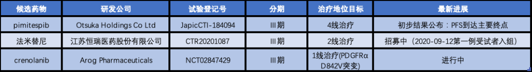 Crenolanib是Arog Pharmaceuticals公司开发的PDGFRα D842V 突变特异性抑制剂,先前的剂量爬坡试验结果表明,crenolanib治疗PDGFRα D842V突变晚期GIST患者有31%获得临床益处。在总共接受治疗的16例患者当中,2例患者达到了PR,3例患者达到了SD。基于以上研究成果,crenolanib治疗PDGFRα D842V突变GIST患者开启了Ⅲ期临床试验。目前,该临床试验患者招募已完成,预计试验结束时间是2021年8月。