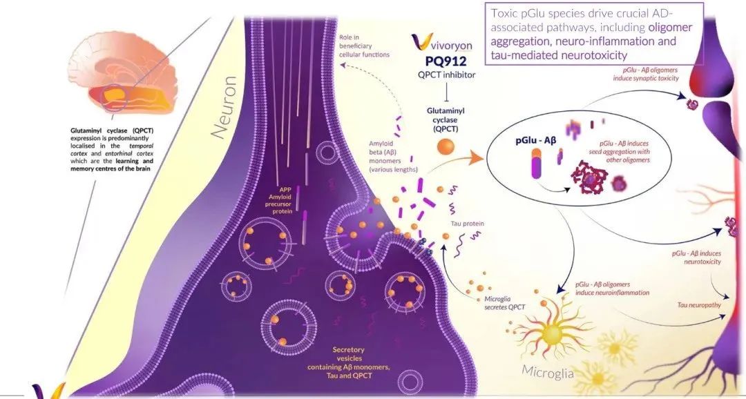 SIM0408是一种谷氨酰肽环转移酶 (QPCT) 的口服小分子抑制剂。研究表明,QPCT可催化一种具有神经毒性的分子N3pE淀粉样蛋白生成,这种蛋白不仅与阿尔茨海默病患者中广泛观察到的聚合成斑块的β淀粉样多肽有关,也会对阿尔茨海默病的其他病理因素产生不良影响。PQ912通过阻止这种有毒变体的形成,在疾病发病机制的早期发挥作用,因此具有预防神经元损伤的潜力。目前,SIM0408在欧洲和美国分别进入IIb期(VIVIAD研究)和IIa/b期(VIVA-MIND研究),2021年12月,SIM0408被美国FDA授予快速通道的资格认定,先声药业方面表示,其有望在全球加速审评上市。