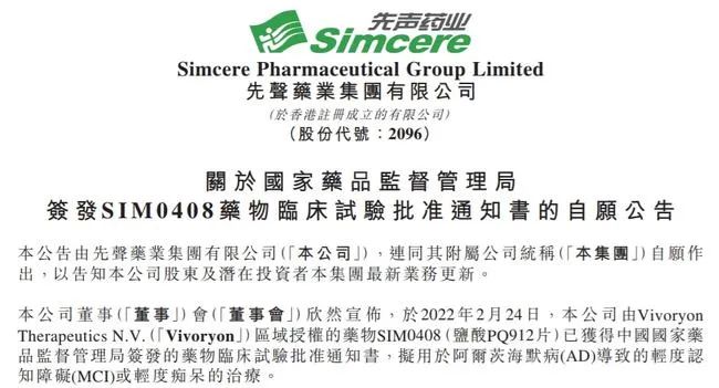 近日,先声药业发布公告称,其在研口服小分子药物SIM0408(PQ912、varoglutamstat),已获得国家药品监督管理局签发的药物临床试验批准通知书,拟用于阿尔茨海默病 (AD) 导致的轻度认知障碍 (MCI) 或轻度痴呆的治疗。