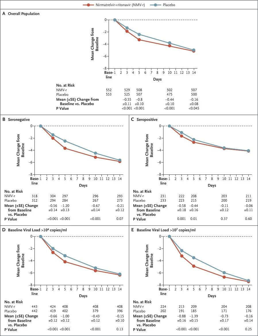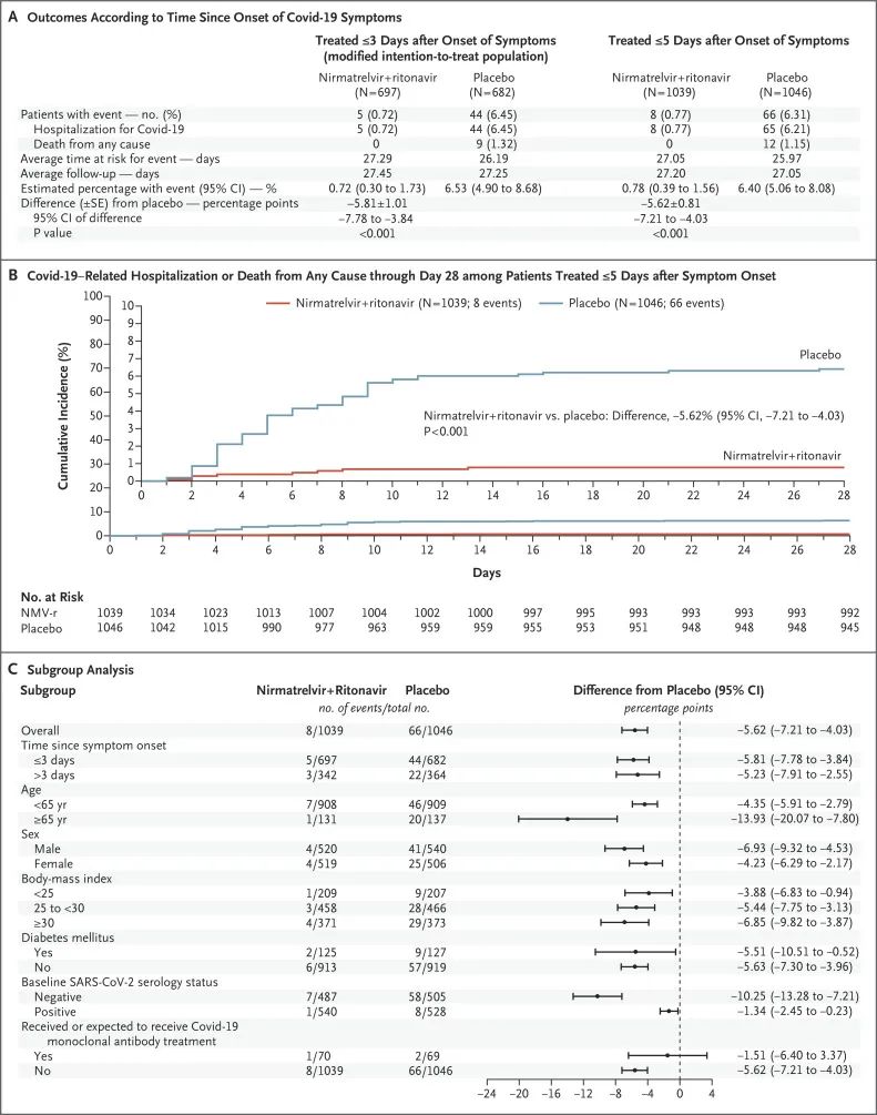 这项在未接种疫苗者中进行的2-3期试验的结果证明了nirmatrelvir(300 mg)与利托那韦(100 mg)口服给药每12小时一次,持续5天的疗效。在分析中发现该方案在进展为重度疾病高风险的非住院成人中,Covid-19相关住院或第28天因任何原因死亡的相对风险降低89.1%。在症状发作后3天内和5天内开始治疗的患者中观察到相对风险分别降低88.9%和87.8%,Paxlovid组中发生0例死亡,安慰剂组中发生13例死亡。该疗效得到了主要终点亚组分析的支持;无论年龄、性别、人种、BMI、基线血清学状态、病毒载量如何,接受Paxlovid治疗的患者或者无Covid-19相关住院或全因死亡,或者风险显著低于安慰剂组,共存疾病或基线时共存疾病的数量。与安慰剂相比,Paxlovid治疗也与第5天SARS-CoV-2病毒载量额外降低10倍相关。