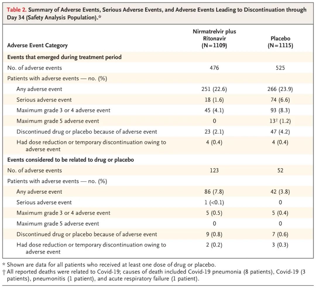 接受Paxlovid治疗的患者报告3级或4级不良事件少于安慰剂接受者(4.1%vs. 8.3%),严重不良事件较少(1.6%vs. 6.6%)。