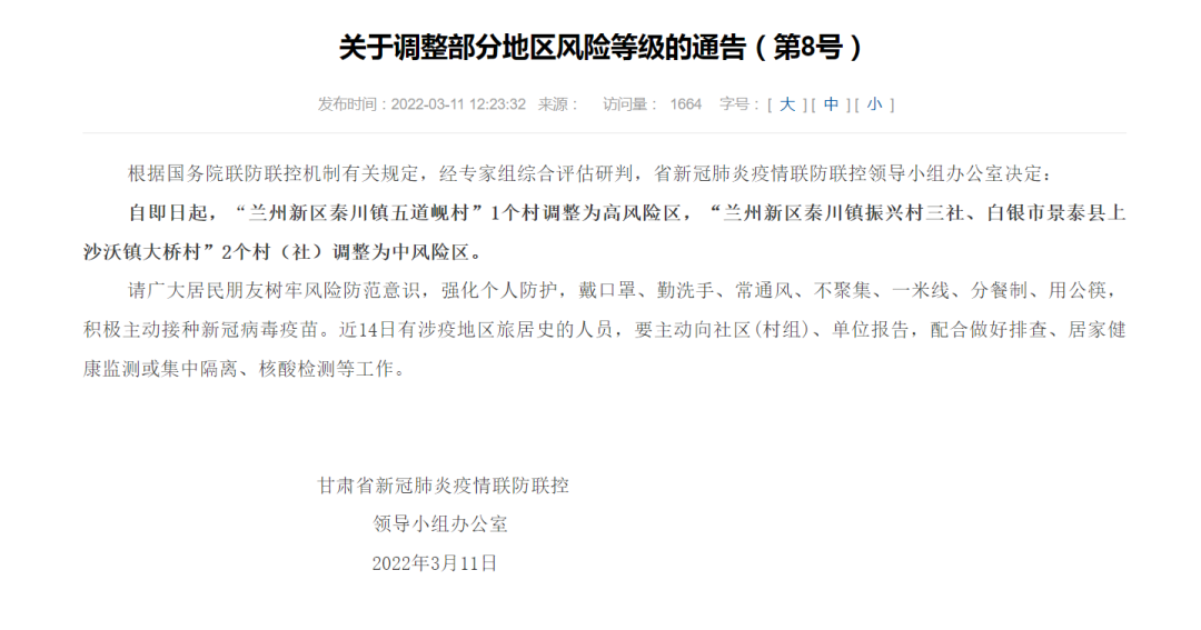 自即日起,“兰州新区秦川镇五道岘村”1个村调整为高风险区,“兰州新区秦川镇振兴村三社、白银市景泰县上沙沃镇大桥村”2个村(社)调整为中风险区。