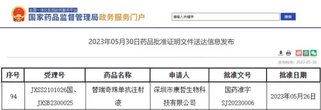 2023年5月26日,康哲药业IL-23抗体替瑞奇珠单抗注射液获得NMPA批准上市,用于治疗适合系统治疗或光疗的中度至重度斑块状银屑病成人患者,商品名为益路取。替瑞奇珠单抗为国内本土药企中首家上市的IL-23抗体,也是国内本土药企中首家上市的Th17通路抗体药物。