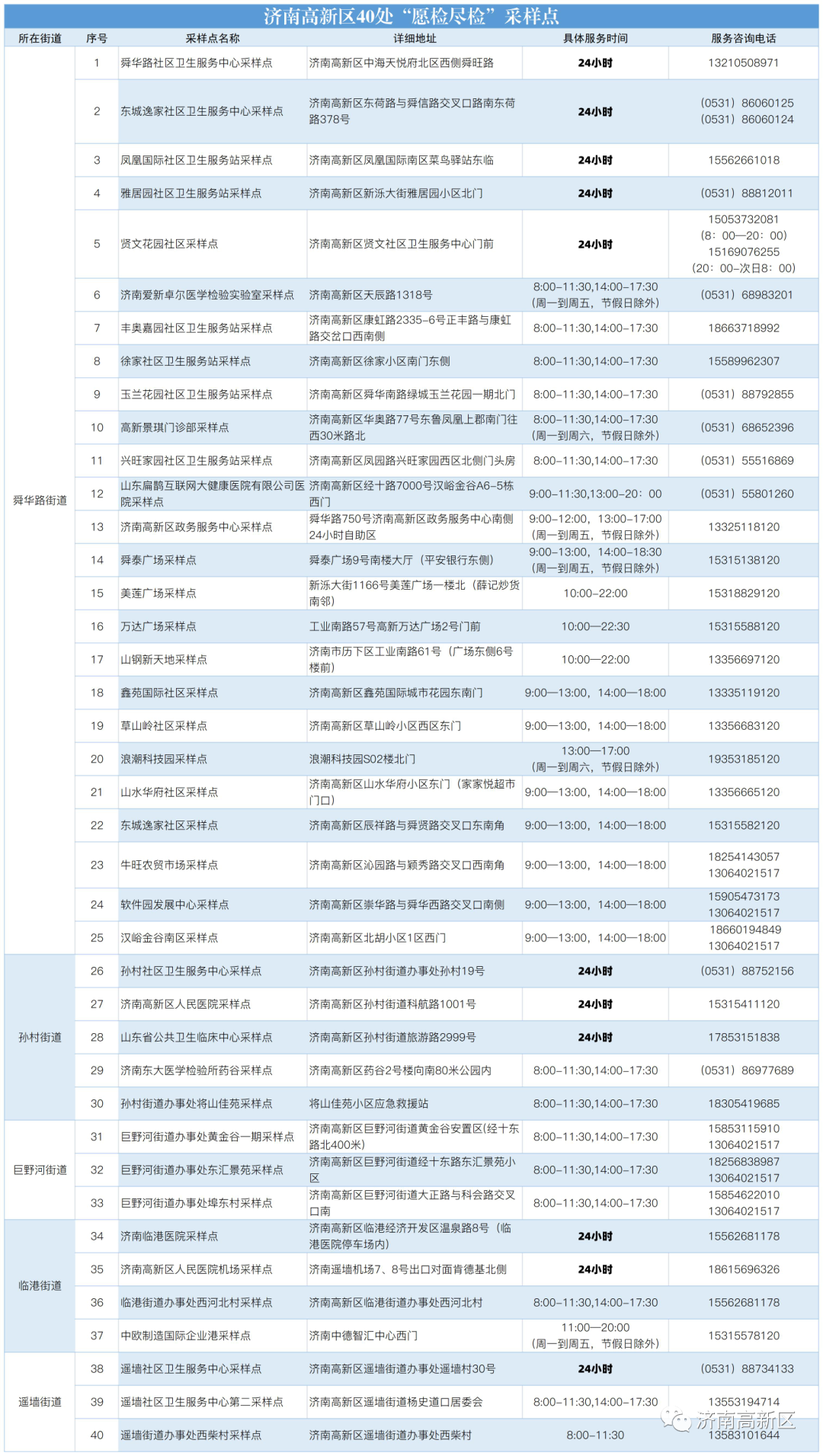 济南高新区目前“愿检尽检”核酸采样点总数40处,其中24小时采样点11处,以人性化的点位和时间设置,让群众就近检、方便检。大家可根据一览表上采样地址、服务时间等信息就近选择服务,若有疑问还可电话咨询。一起来了解详情: