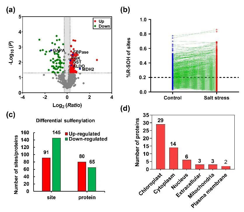进一步生信分析发现,亚磺酰化修饰蛋白大多分布在叶绿体和细胞质中。功能富集分析揭示,在光合作用以及糖酵解等代谢途径有大量的酶发生被修饰。在盐胁迫条件下,细胞内的总体氧化修饰水平表现出明显的上升趋势,并有大量蛋白从低修饰水平