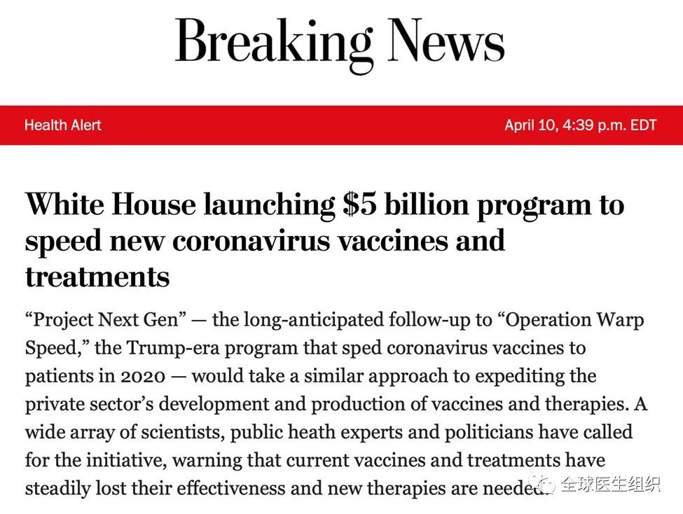 美国政府已筹划投资50多亿美元的“新冠项目”,名为“下一代项目”(ProjectNext Gen),作为后疫情时代旨在加速新冠病毒新型疫苗和创新治疗方法的研发和转化应用。