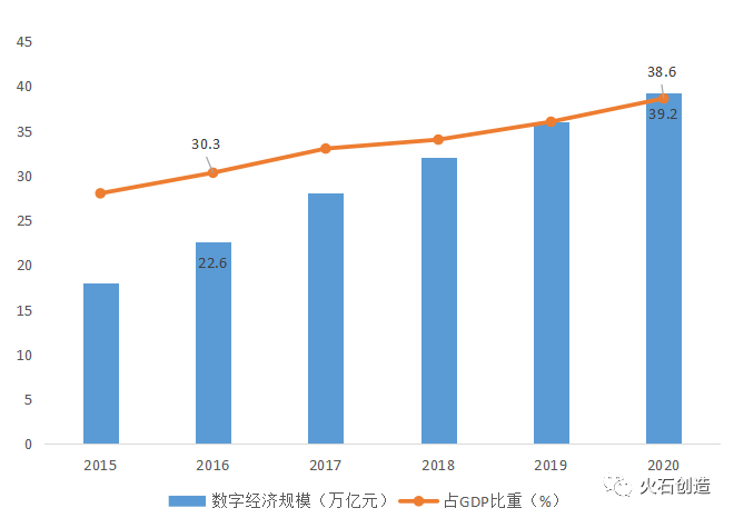 我国数字经济起初是从互联网消费开始发展,借助庞大的用户群体,以及数字经济技术创新。数字经济市场规模从2016年的22.6万亿元提升到2020年的39.2万亿元,占比从30.3%上升到38.6%(见图3),其增长速度是GDP增速的三倍以上。预计2021、2022年数字经济规模将持续增长,达到45.7