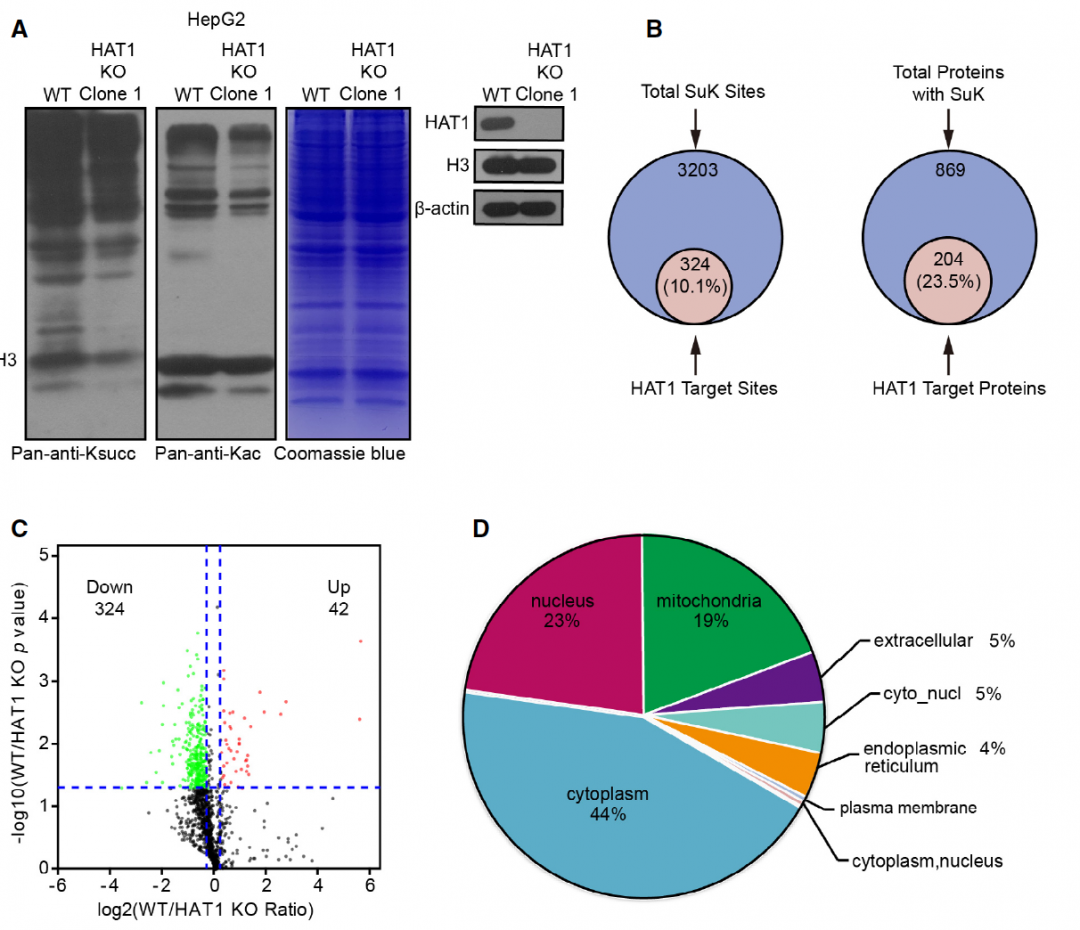 为了研究HAT1是否具有调节琥珀酰化修饰的功能,作者应用CRISPR/Cas9技术在HepG2肝癌细胞系中稳定敲除HAT1(样本策略)。除影响乙酰化修饰外,研究发现HAT1敲除能够显著降低细胞内整体琥珀酰化修饰水平,且对其他酰化修饰丁酰化、巴豆酰化等无明显影响。通过进一步琥珀酰化修饰组学检测