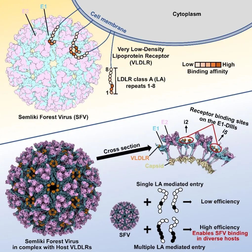新型受体通过多个LA串联结构域协同介导甲病毒SFV的跨物种传播(图片来自Cell文章graphic abstract)