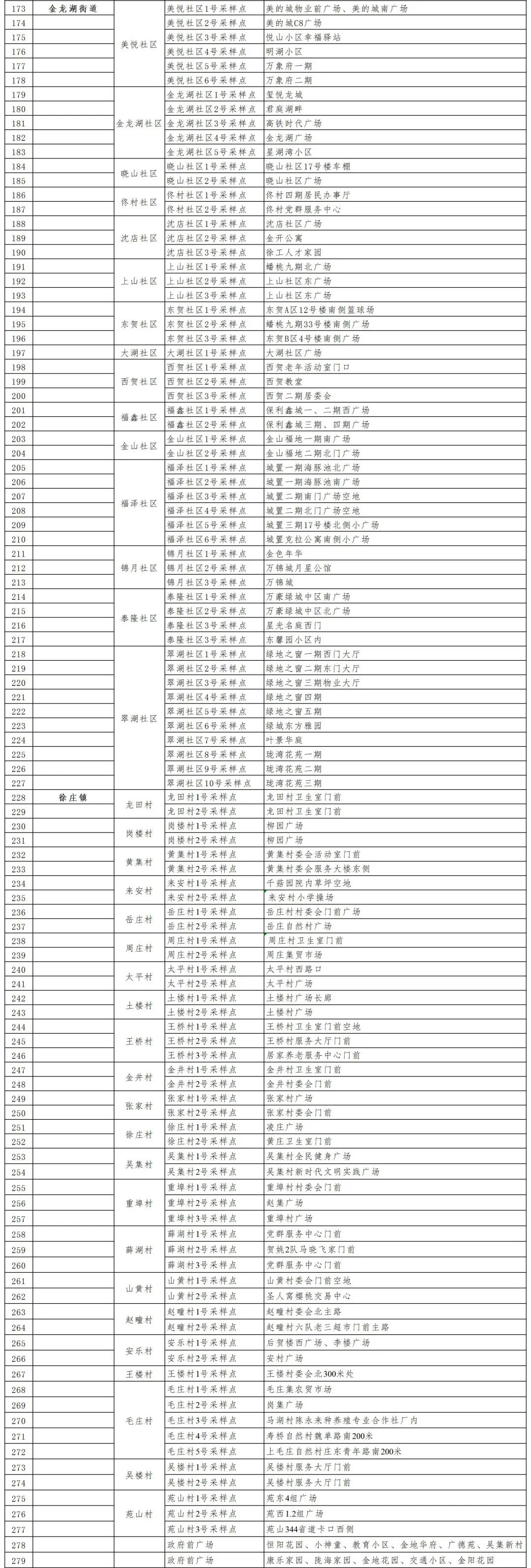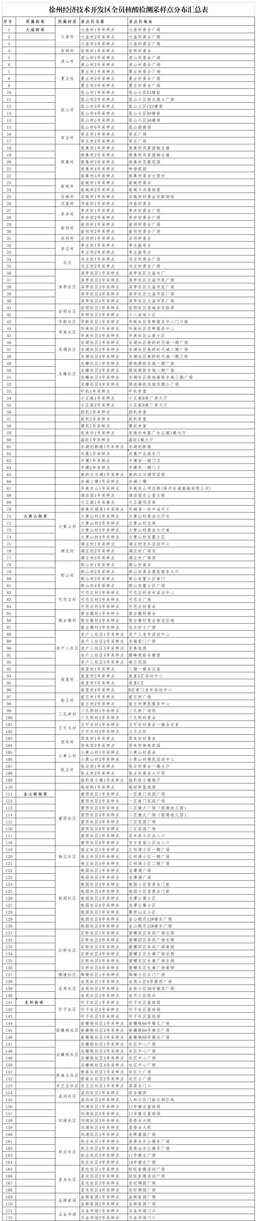 见附件《徐州经济技术开发区全员核酸检测采样点位分布汇总表》(具体以街道、社区通知为准)。