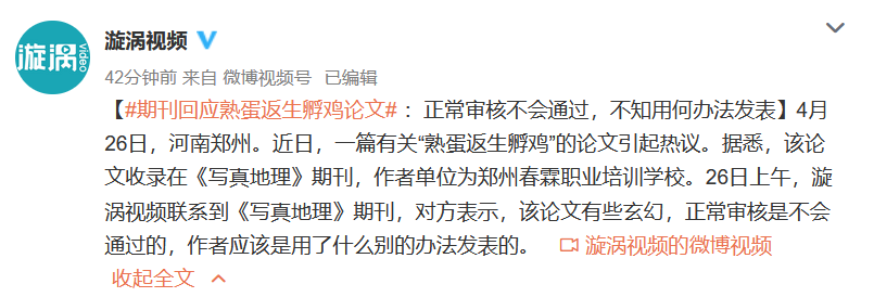 4月26日上午,漩涡视频联系到《写真地理》期刊,对方表示,该论文有些玄幻,正常审核是不会通过的,作者应该是用了什么别的办法发表的。