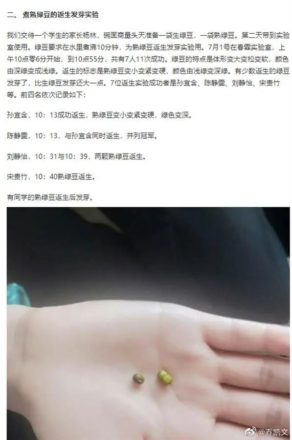 记者:有资料显示,你还发表了关于“煮熟绿豆返生发芽”的文章,这个实验超出了普通人的常识判断。