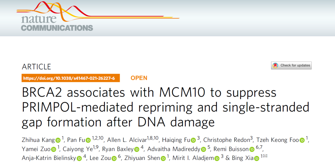 近年来的研究表明,BRCA2除了参与同源重组修复外,似乎也影响DNA复制过程,但其机制十分不清。2021年10月13日,美国罗格斯肿瘤研究所Bing Xia教授团队(第一作者:康志华博士)在Nature Communications上发表论著BRCA2 associates with MCM10 to suppress PRIMPOL-mediated repriming and single-stranded gap formation after DNA damage,揭示BRCA2可直接与DNA复制关键蛋白MCM10结合,抑制DNA损伤后复制过程中单链DNA断裂的产生。