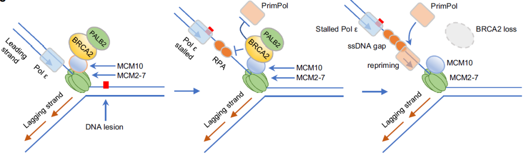 研究人员发现,BRCA2缺失所致的DNA复制延伸增加,与一种名为PRIMPOL的蛋白在DNA双链上异常积累有关,它帮助DNA复制子跨过DNA损伤,以促使细胞完成复制过程,可代价是在新合成DNA链残留大量单链断裂。