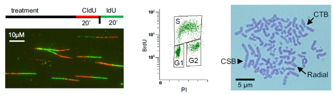 在这项研究中,研究团队通过流式细胞术,发现经DNA损伤后,BRCA2缺失细胞存在DNA复制增加的现象,随后利用活细胞DNA标记技术显示DNA复制增加是由DNA复制延伸过度所致。这造成BRCA2缺失细胞中新合成DNA链存在较多单链断裂,如果单链断裂过多而超过细胞的修复能力,则会进一步导致染色体断裂。