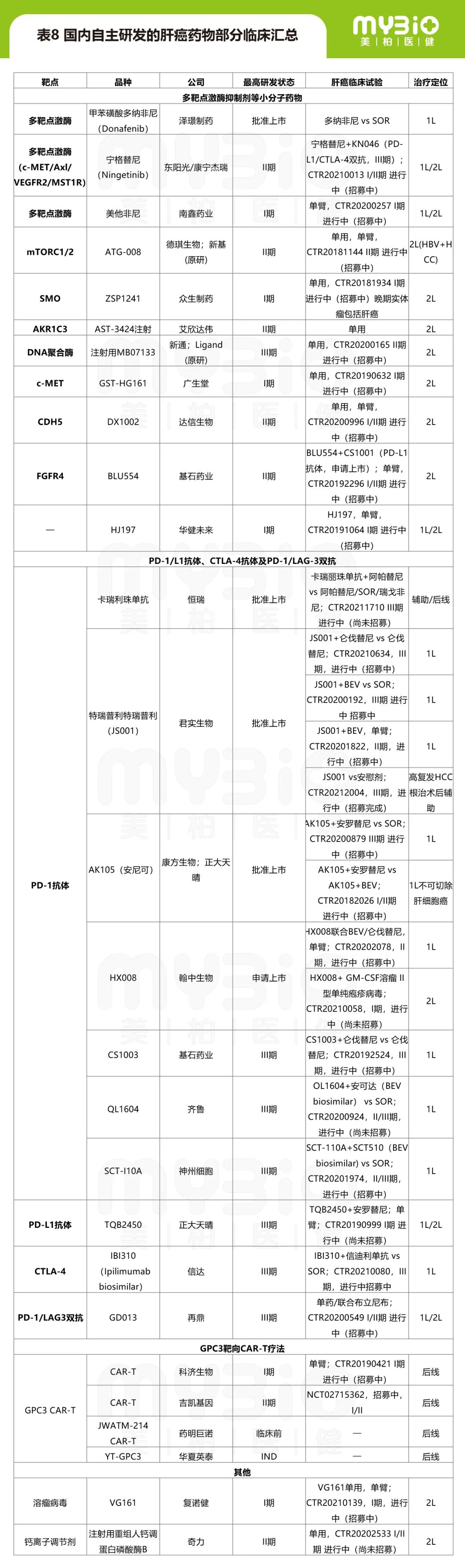 随着免疫检查点抑制剂的上市,给靶向疗法不耐受患者或者产生耐药性的患者带来了希望。免疫检查点抑制剂(PD-1/L1、CTLA-4,LAG-3等)、靶向GPC3的CAR-T疗法和TCR-T细胞疗法、肿瘤疫苗等其他免疫疗法成为肝癌研发的新探索方向。