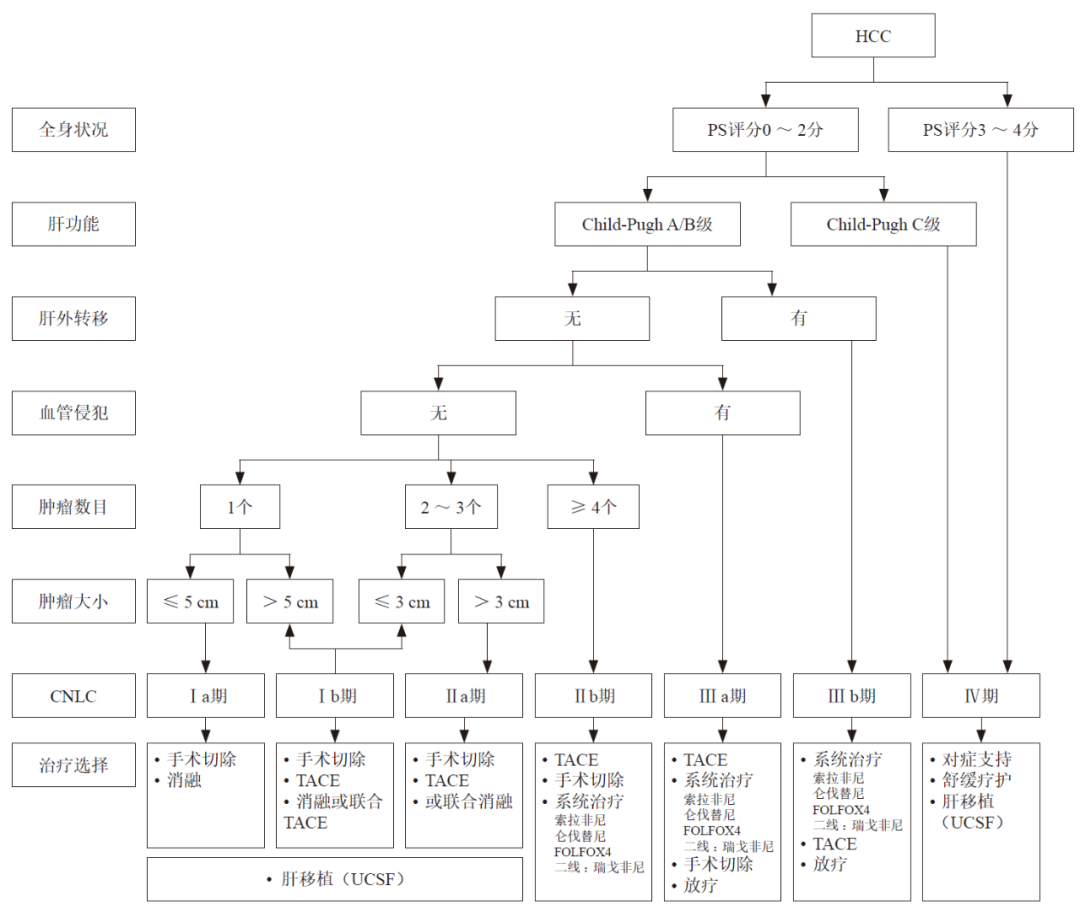 IIb期-IIIb期肝癌患者,一线治疗为:TACE、索拉非尼、仑伐替尼和FOLFOX4 (氟尿嘧啶+奥沙利铂+亚叶酸钙) 。二线治疗为瑞戈非尼。IV期肝癌患者的治疗,主要为对症支持、舒缓疗护和肝移植。此共识未涉及后来上市治疗肝癌的免疫疗法。中国肝癌临床分期的治疗路线见图9。
