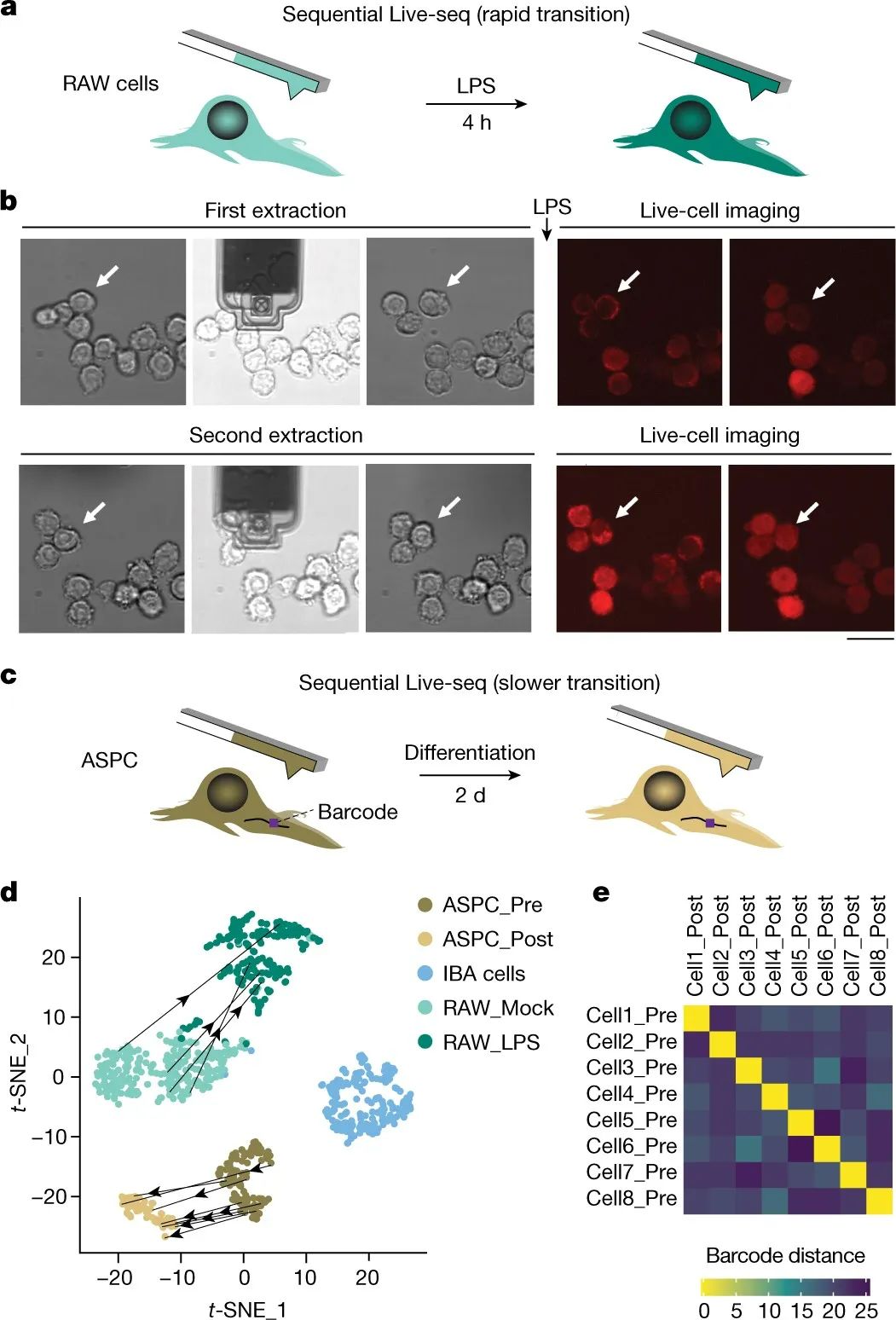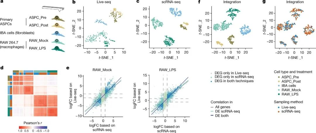 图5. Live-Seq对细胞的多次提取,连续测序的示意图和代表图像;整合Live-Seq和scRNA-Seq的tSNE图。