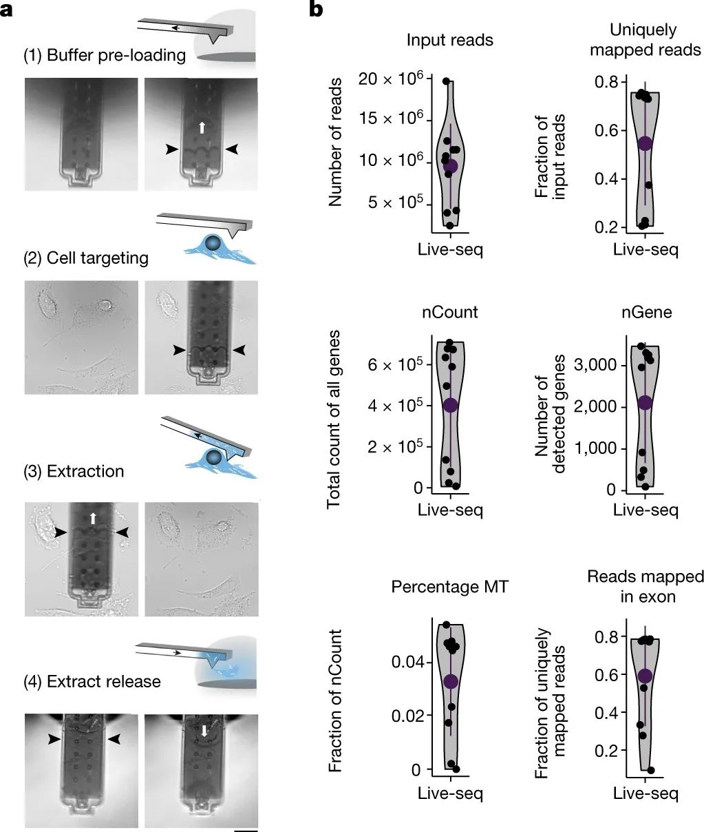 a. Live-Seq技术的示意图和代表图片,黑色箭头指液体位置;b. IBA细胞测序的质量控制图(n=10)。