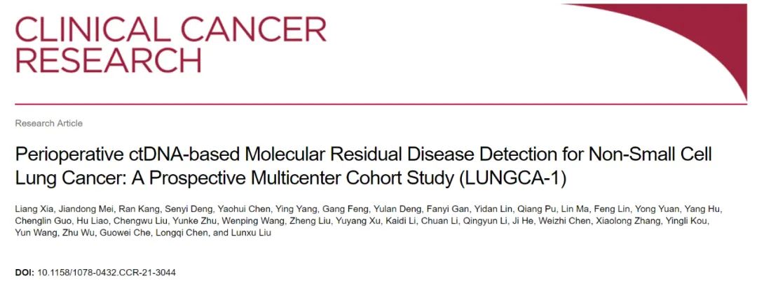 2021年11月,Clinical Cancer Research杂志(中科院1区TOP期刊,IF= 12.531)发表了由四川大学华西医院刘伦旭教授团队联合四川省人民医院、成都上锦南府医院、无锡臻和生物科技有限公司(以下简称“臻和科技”)合作的研究成果“Perioperative ctDNA-based Molecular Residual Disease Detection for Non-Small Cell Lung Cancer: A Prospective Multicenter Cohort Study (LUNGCA-1)”。