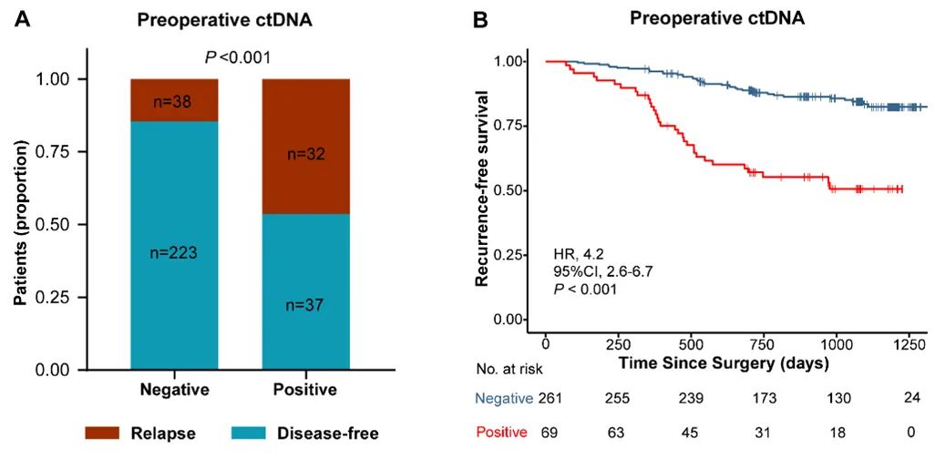 术前ctDNA阳性患者中46.4%(32/69)出现术后复发,而阴性患者中仅14.6%(38/261)术后复发(P<0.001)< span="">(图2A)。术前ctDNA阳性患者的RFS显著低于ctDNA阴性患者(HR 4.2;95%CI, 2.6-6.7; P<0.001)< span="">(图2B)。术前ctDNA状态是RFS的独立风险因素(HR 2.6,95%CI 1.3-5.1;P=0.005)。
