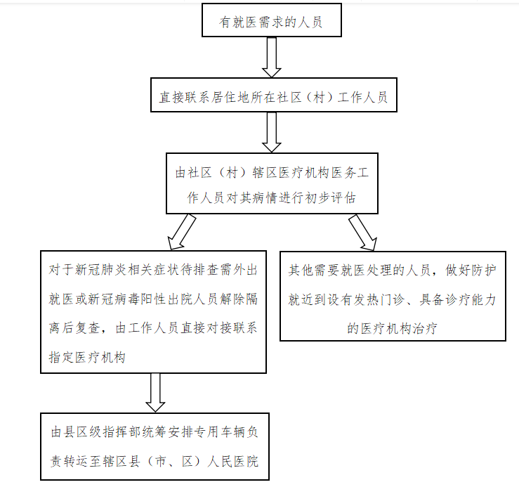 1.新冠肺炎相关症状待排查人员,就近到设有发热门诊且具备诊疗能力的医疗机构治疗;其他需要就医处理的人员,自行选择前往医疗机构治疗。
