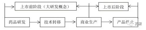 5)评估和批准相应的供应商。在早期研发阶段应协助研发人员从未来商业化生产和GMP合规的角度选择合适的供应商,保证项目物料来源的合规性;通常在技术转移阶段供应商确定后,再对供应商进行审计,以满足未来商业化生产阶段GMP对于供应商的要求。 6)及时跟进国内外质量管理相关法律法规,提供有效的法规符合性支持,并反馈执行到研发质量管理活动中,持续维护药品研发质量管理体系的质量符合性。 2.2 树立“大研发”的概念,分阶段制定质量管理规程 本文所述“大研发”指的是上市之前的所有阶段,包括ICH Q10中所指的药品研发、技术转移(新产品由研发向生产转移)和批准上市前涉及到的发生在商业化车间的活动,比如注册批样品的生产、无菌制剂的工艺验证等。如图 2所示。 ![]()