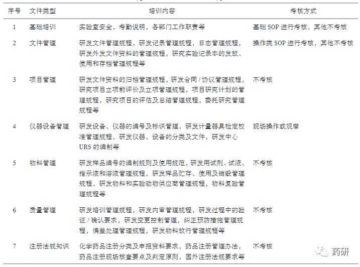 2.4 加强培训,确保和巩固培训效果 研发人员的培训是研发质量管理体系的一个重要内容,培训内容包括入职培训、岗前培训和在岗员工的持续培训。应当由各部门主管针对本部门情况制定年度培训计划,明确培训对象、培训目标和内容、考核方式等。培训计划经研发质量管理部门和部门负责人审核后执行,并报人力资源部门备案。 系统的入职培训可以使新员工快速了解研发质量管理体系,培训内容涵盖文件记录管理、项目管理、仪器设备管理、物料管理、质量管理的相关SOP以及注册法规知识。 对员工的岗前培训需要根据各部门制定的相应岗位培训目录,由各部门进行上岗培训,并依据培训目标实施考核。理论和岗位操作合格后,申请并获得岗位资格证后才可进行岗位操作。以从事微生物测定的新员工为例,申请上岗证需要完成的培训有文件管理、验证管理、方法学验证等SMPs,器具灭菌、培养基灵敏度试验、隔离器操作、环境监测、清洁消毒等SOP,具体检测项目检验规程及法规类等。 持续培训包括更新的法规培训、SOP更新培训、知识技能提升培训、换岗后的再培训以及关键岗位定期再培训等。各部门主管根据工作需要,每年应系统性地安排员工进行专业技术和岗位工作技能培训,培训方式可采取内训(如岗位SOP培训、专家讲座、技术讨论等)或外出培训,外出培训结束后回公司进行相关人员的返训。研发质量管理体系相关部门所有员工每年应参加GMP及药品相关法规培训;进入洁净区的人员,每年还应定期进行微生物学知识等洁净作业相关的培训,进入B级洁净区人员还应进行更衣操作和更衣后表面微生物监测评价。如有新出台或新修订的药品法规,应及时进行解读和培训。表 2为某制药企业研发中心质量研究室岗位培训目录。