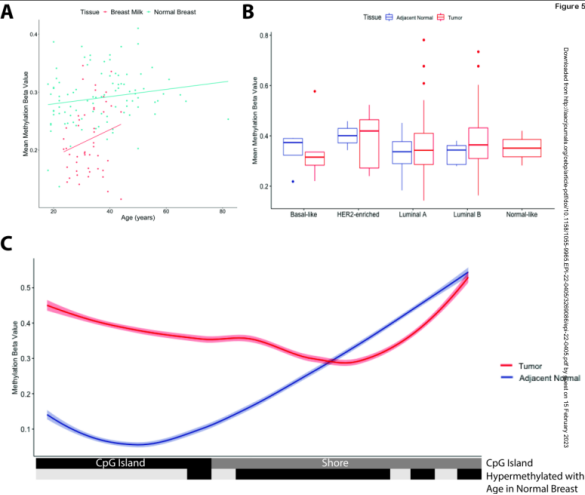 利用基因组DNA甲基化数据,研究者比较了已确定的乳腺癌危险因素与乳房组织和母乳中DNA甲基化的关系。结果显示与乳腺癌疾病风险相关的分子变化可能在母乳中被检测到。此外,虽然使用母乳作为疾病风险的潜在生物标志物仅限于哺乳期妇女,但母乳中的发现有可能扩展到从非哺乳期妇女收集的乳头溢液中。