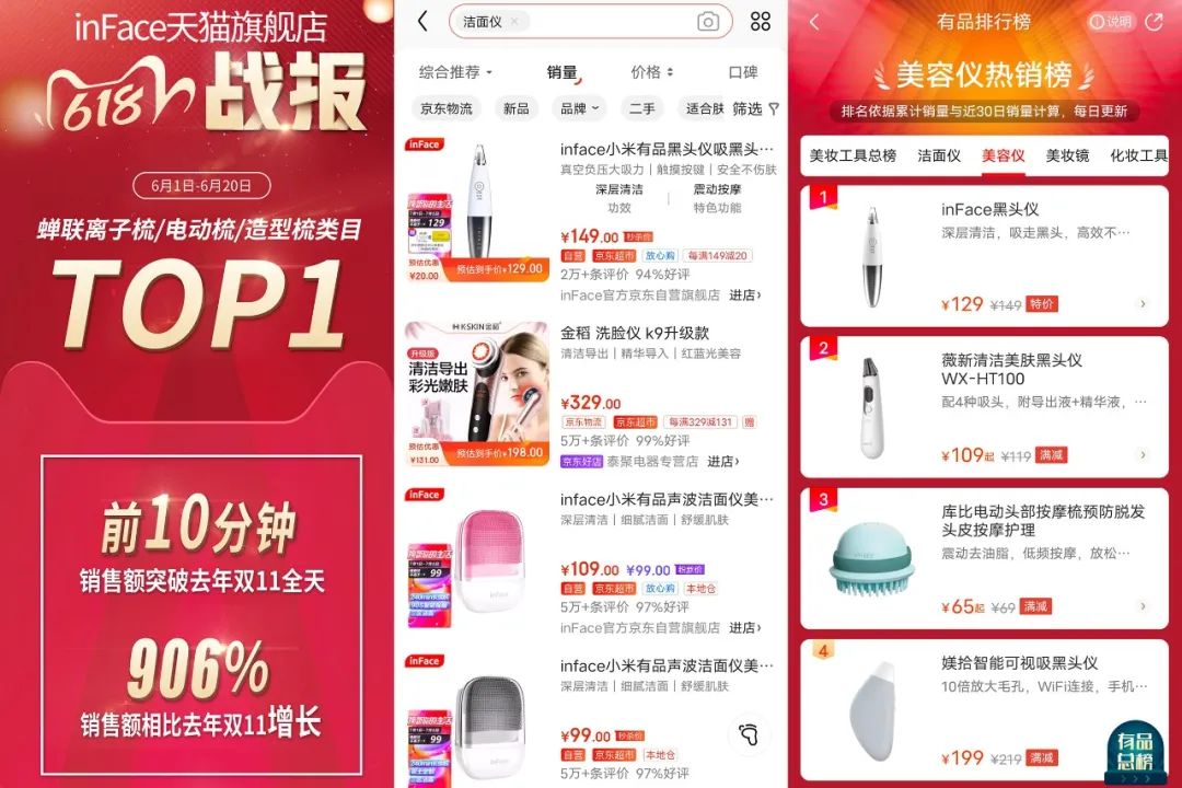 inFace声波洁面仪是2018小米众筹年度代表产品,斩获了有「设计界的奥斯卡」之称的德国iF设计大奖,销量常年位居小米有品、京东品类榜首,且在有品上的销量和有效评论数是第二名的数倍。inFace黑头仪是2019小米众筹美护类首款破千万产品,在小米有品、京东平台都是销量、搜索上排序的头部产品。inFace直卷发梳从2021年3月份到618,稳居天猫造型梳/离子梳品类TOP1。