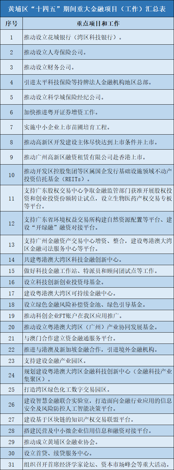 “十四五”时期,黄埔区、广州开发区将以服务实体经济为宗旨,以加速集聚创新资本、壮大金融组织体系为突破口,以完善金融支持创新体系为着力点,以提升金融科技水平为支撑,力争到2025年,基本建成金融“三中心一高地”,即把黄埔建设成为服务粤港澳大湾区、具有国际影响力的创新资本中心、科技金融创新中心、可持续金融中心、金融科技高地,金融业成为支柱产业,为全区建设具有全球竞争力的产业高地、打造粤港澳大湾区高质量发展重要引擎提供强有力的金融支撑。