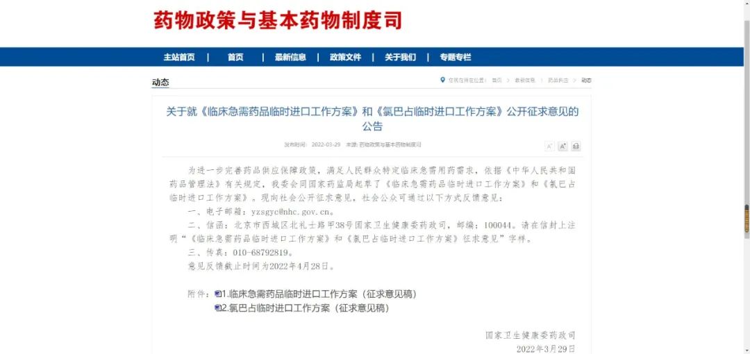 关于就《临床急需药品临时进口工作方案》和《氯巴占临时进口工作方案》公开征求意见的公告