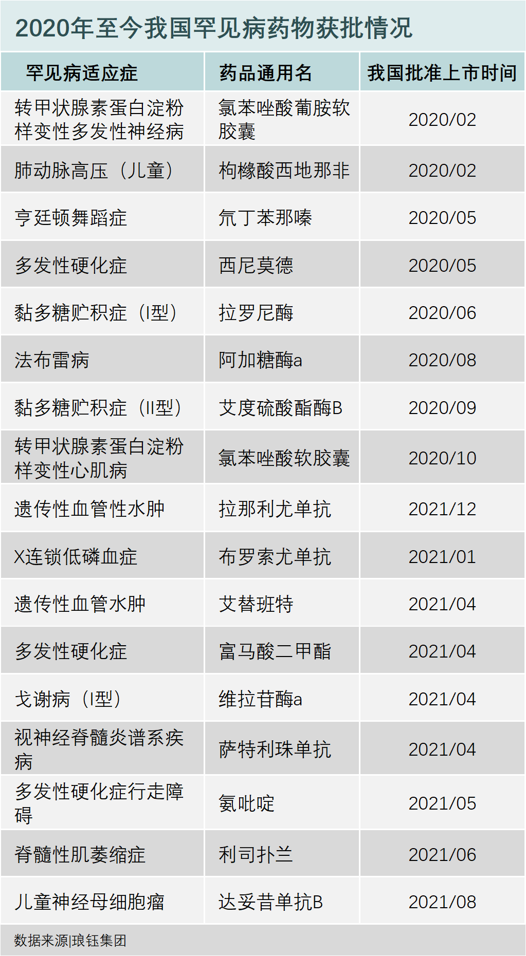 据琅钰集团副总裁李杨阳女士介绍,仅仅2020年至今,中国就有17种罕见病新药在我国获批上市(见下表)。放眼国外,美国FDA近10年来的新药审评,罕见病药更是成为主角。根据药明康德微信公众号统计,2020年,FDA批准的罕见病药数目达31个,占全年获批新药58.5%。而此时,正在撰写中的《罕见病药物临床研发指导原则》或将使罕见病患者获益,规范行业研发。