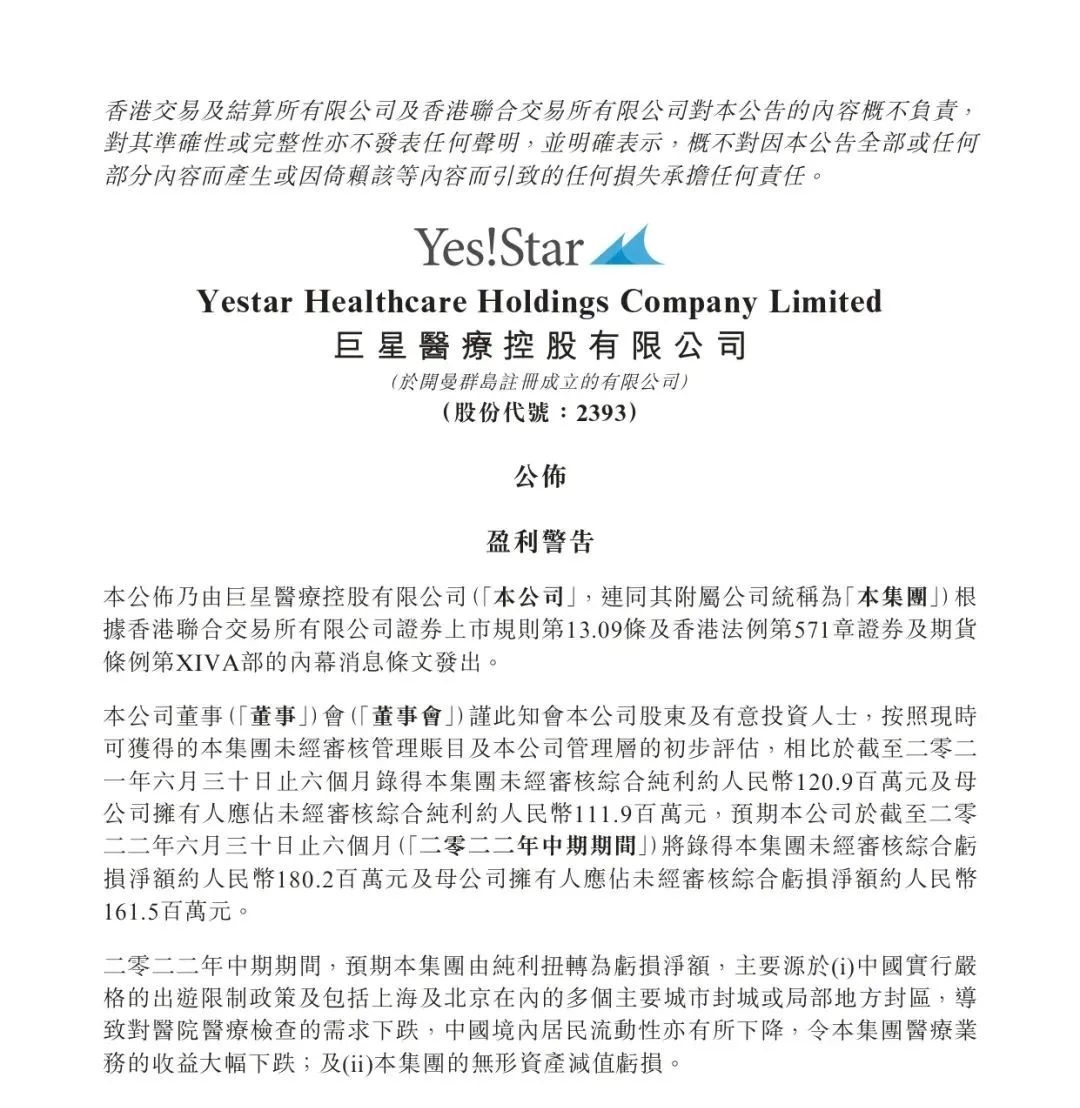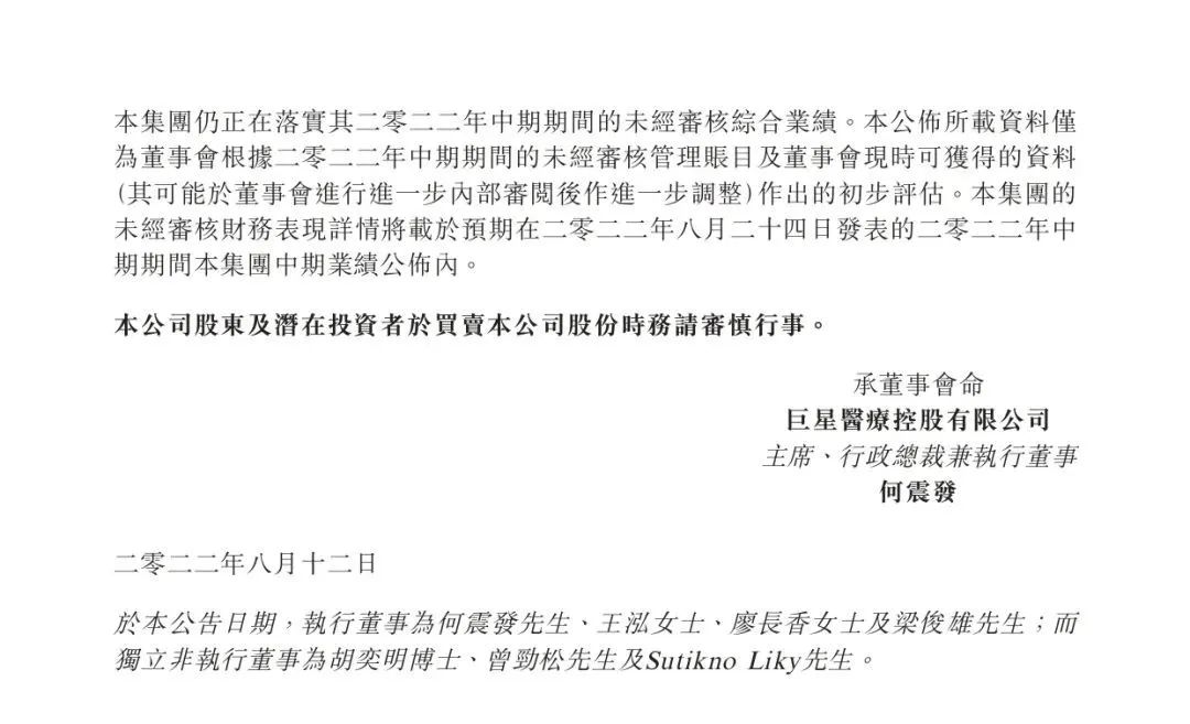 8月12日,巨星医疗发布公告,预期公司于2022年上半年将取得集团未经审核综合亏损净额约人民币1.8亿元及母公司拥有人应占未经审核综合亏损净额约人民币1.62亿元;而去年同期集团未经审核综合纯利约人民币1.21亿元及母公司拥有人应占未经审核综合纯利约人民币1.12亿元。