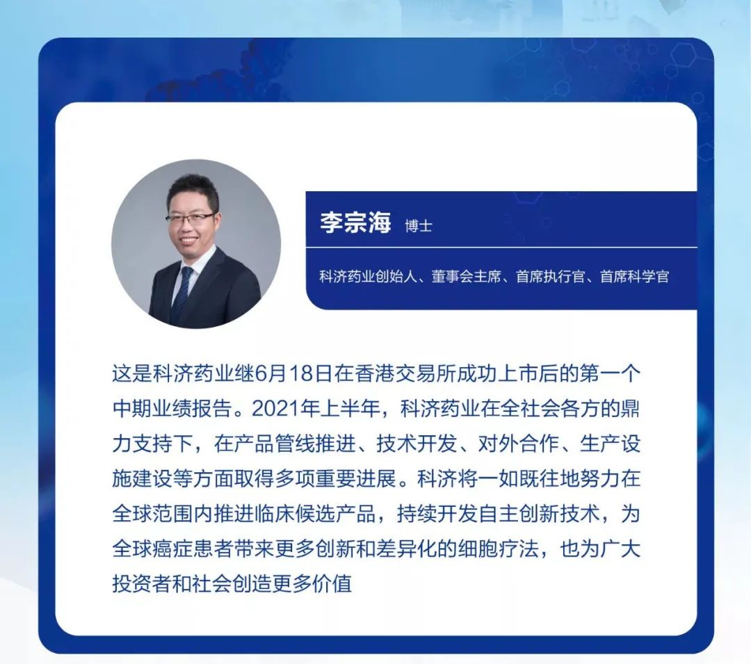 科济药业创始人、董事会主席、首席执行官、首席科学官李宗海博士表示:“这是科济药业继2021年6月18日在香港交易所成功上市后的第一个中期业绩报告。2021年上半年,科济药业在全社会各方的鼎力支持下,在产品管线推进、技术开发、对外合作、生产设施建设等方面取得多项重要进展。科济将一如既往地努力在全球范围内推进临床候选产品,持续开发自主创新技术,为全球癌症患者带来更多创新和差异化的细胞疗法,也为广大投资者和社会创造更多价值”
