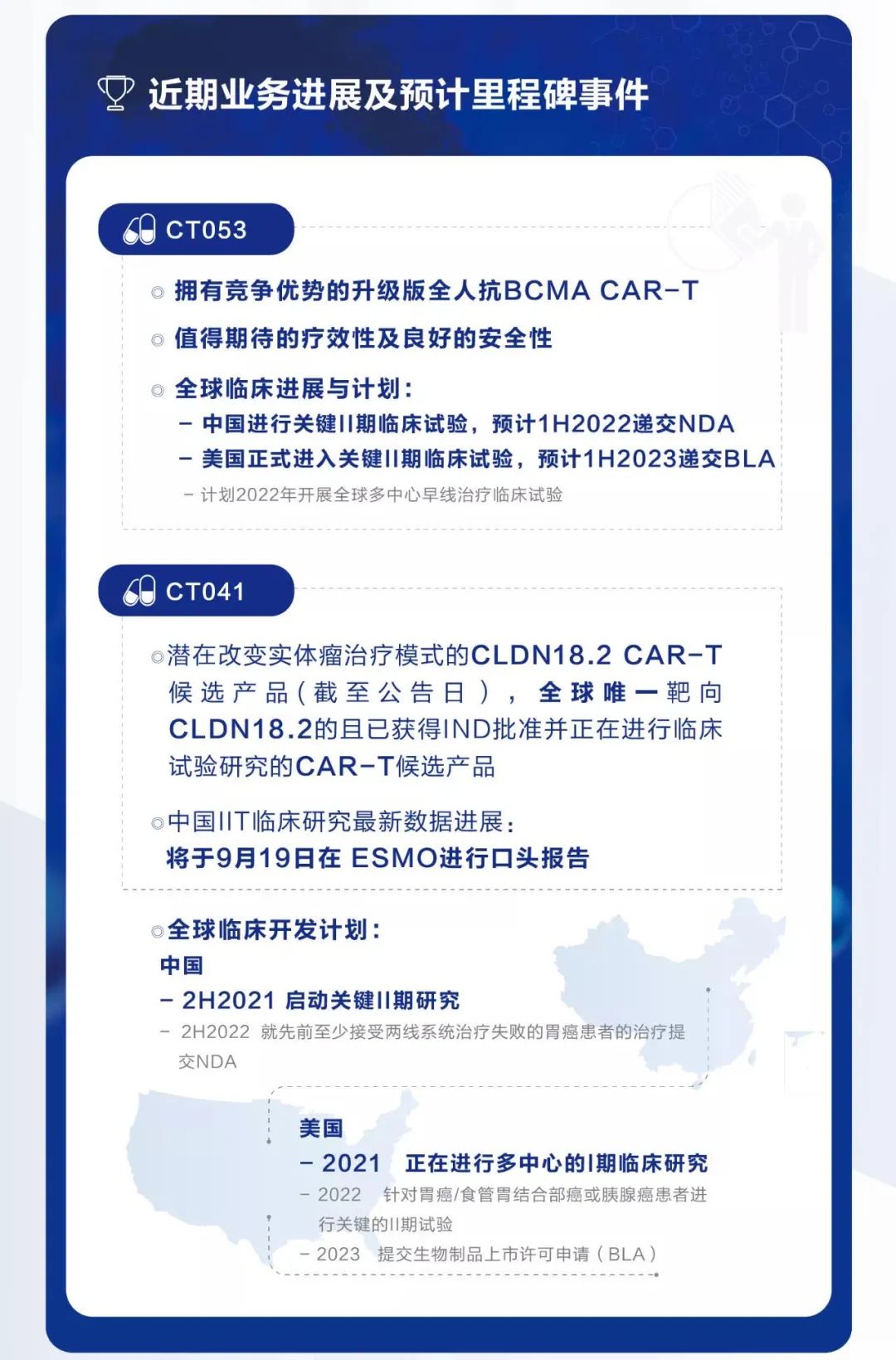 另一款CT041为全球唯一靶向CLDN18.2的且已获得美国FDA和国家药监局的IND批准并正在进行临床试验研究的CAR-T候选产品,用于治疗胃癌和胰腺癌等实体瘤,已获得FDA及EMA孤儿药产品认定。有望实现CAR-T疗法在实体瘤治疗领域的突破。科济药业将于9月19日ESMO大会上对CT041 中国研究者发起试验(IIT)数据进展进行口头报告。此外,2021年上半年,科济药业已在中国向NMPA提交关键II期研究的咨询申请,并计划于2021年下半年启动关键II期临床试验,2022年下半年就先前至少接受两线系统治疗失败的胃癌患者的治疗提交NDA。在美国,公司计划于2022年对胃癌╱食管胃结合部癌或胰腺癌患者进行关键的II期试验,2023年向美国FDA提交BLA。CT041已获得美国FDA授予「孤儿药」认定,用于治疗胃癌/胃食管结合部癌,并获得EMA授予「孤儿药产品」认定,用于治疗胃癌。