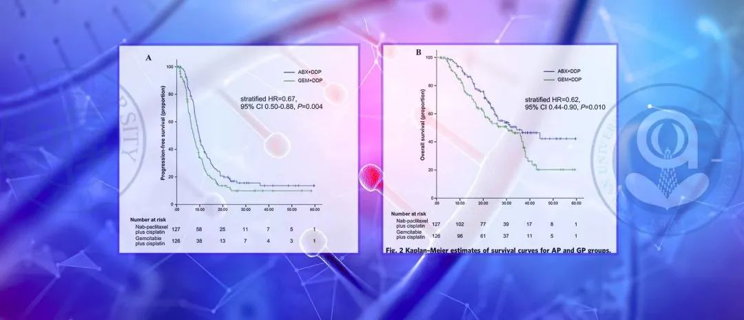 在有效率方面,白蛋白紫杉醇+顺铂组的客观有效率也显著高于吉西他滨+顺铂组(81.1%对56.3%;P<0.001)。中位总生存(OS)在白蛋白紫杉醇+顺铂组以及吉西他滨+顺铂组分别为26.3个月以及22.9个月(HR为0.62;95%CI 0.44~0.90;P=0.01)。