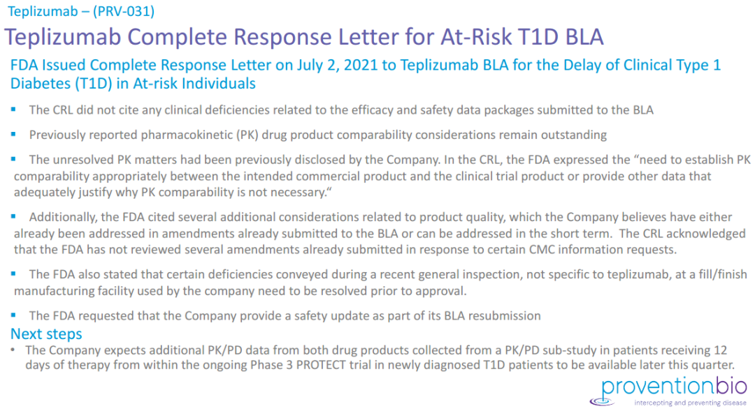 CRL中没有提及任何与安全性和有效性相关的数据缺陷,并且已经确认了teplizumab拟定的商品名的可接受性。