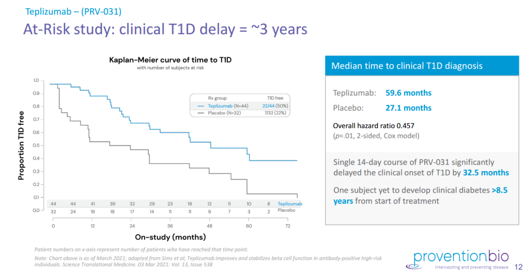 20201年3月更新的结果显示,Teplizumab组1型糖尿病临床确诊中位时间为59.6个月,而安慰剂组为27.1个月。与安慰剂组相比,teplizumab使1型糖尿病确诊时间延长了约3年(32.5个月)。