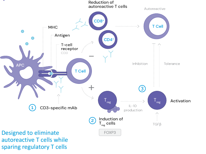 Teplizumab是一种靶向T细胞表面CD3抗原的单克隆抗体,主要通过与效应T细胞表面的CD3结合,抑制其对胰岛β-细胞的攻击,从而降低对胰岛β-细胞的破坏作用。teplizumab的Fc区域通过氨基酸修饰被设计成了Fc受体非结合(FNB)结构,从而减少了其与补体和Fc受体的结合,降低了相关毒性反应。