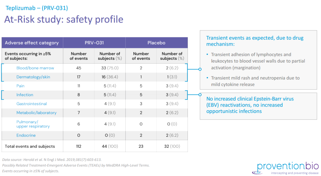 药物不良反应发生情况与机制相关,teplizumab组20例3级事件中,有15例(75%)涉及淋巴细胞减少,均发生在给药30天内。轻度细胞因子释放综合征引起短暂轻度皮疹和中性粒细胞减少。