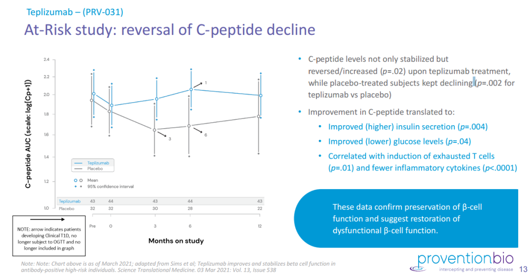 接受teplizumab治疗患者,C-肽水平不仅稳定,而且逆转/增加(p=0.02),而安慰剂组则持续下降。提示,β细胞功能的保留和功能失调β细胞功能的恢复。