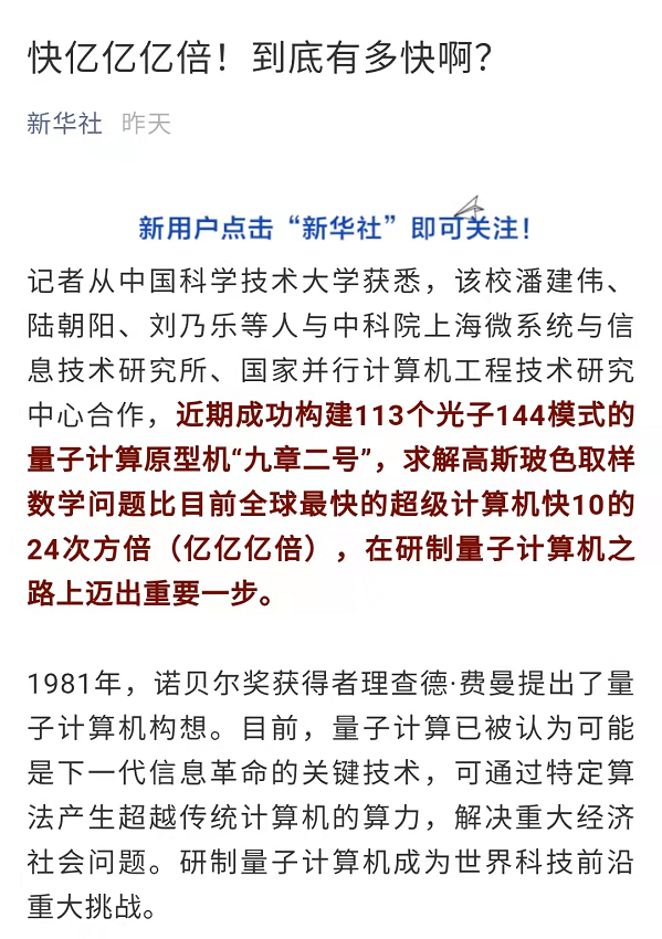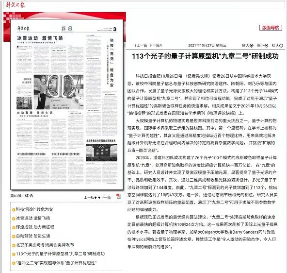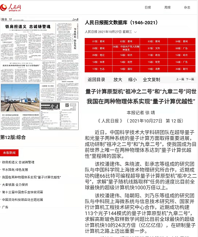(人民日报、新华社、央视新闻、光明日报、科技日报、解放日报、中国新闻网等多家媒体对“九章二号”的成功研制和“祖冲之二号”成功实现超导体系“量子计算优越性”进行报道。)