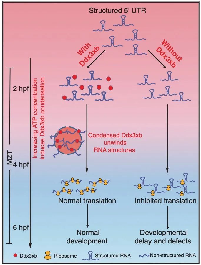 该研究发现在斑马鱼早期胚胎发育过程中Ddx3xb可以在正常的生理条件下发生相分离,Ddx3xb相分离促进了与其结合的母源mRNA 5’UTR区域结构的开放,进而调控这些种类母源mRNA翻译的进行,最终影响母源-合子转换及早期胚胎发育